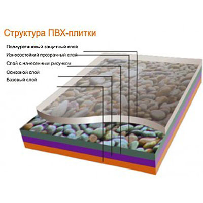 Все слои винилового покрытия соединяются методом горячего прессования, что обеспечивает их прочное сцепление. В результате получается: